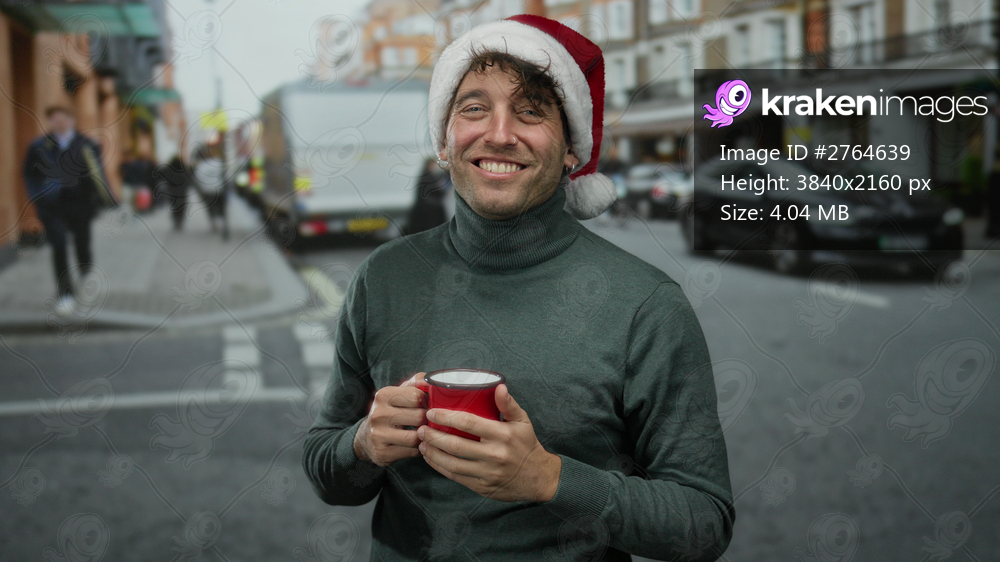 Hispanic man wearing a christmas hat holds a red mug, smiling confidently on a busy street, with blurred pedestrians and cars in the background, showcasing urban holiday cheer. - Kraken Images
