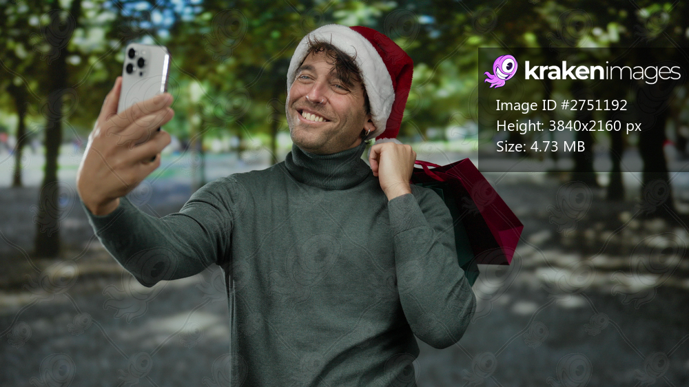 Hispanic man wearing a christmas hat takes a selfie outdoors on a street holding shopping bags with trees in the background, exuding a festive and cheerful mood. - Kraken Images