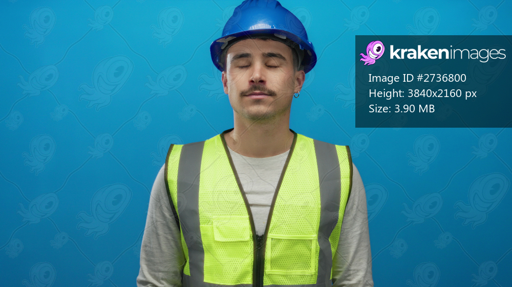 Hispanic man wearing a hardhat and reflective vest stands with eyes closed against an isolated blue background wall, conveying a sense of relaxation and focus in a serene setting. - Kraken Images