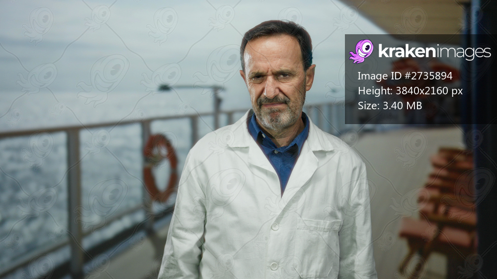 Hispanic man wearing a white coat stands on a seaside boat deck, displaying a defensive expression with ocean in the background, capturing an outdoor maritime setting. - Kraken Images