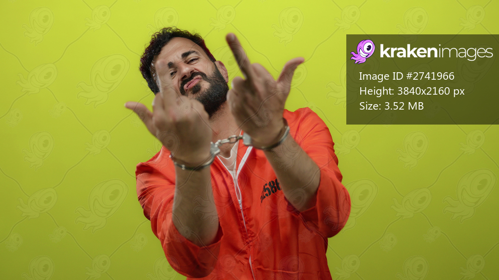 Hispanic man wearing an orange prison jumpsuit and handcuffs makes an offensive gesture against a vibrant yellow background, highlighting defiance in a restricted environment. - Kraken Images