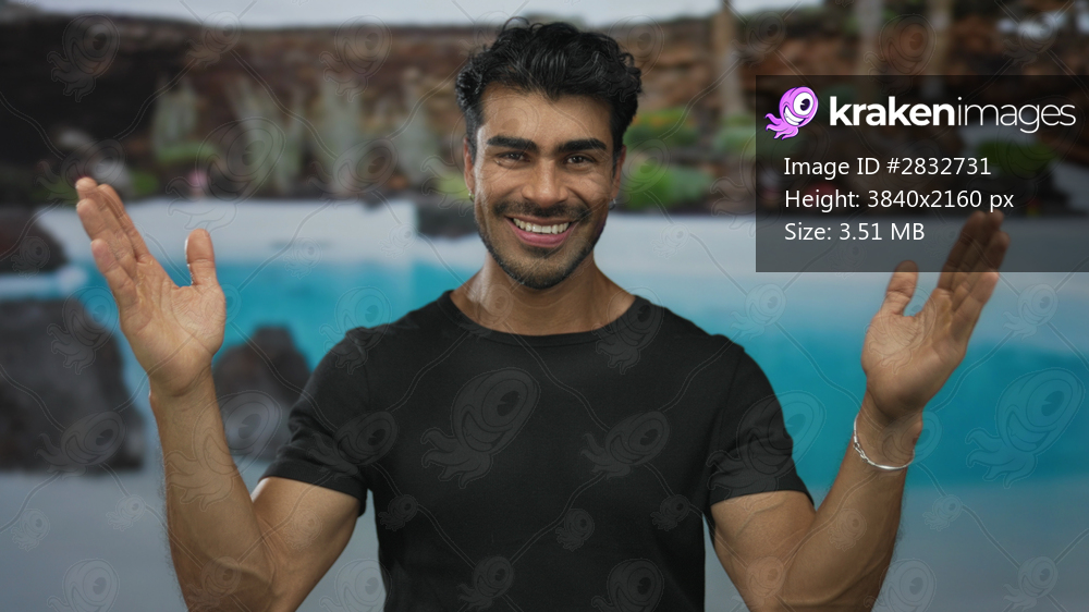 Hispanic man wearing black shirt shows wide hand gesture poolside at resort outdoor pool area; friendliness.