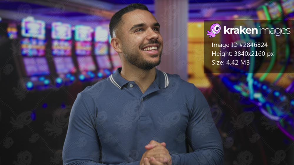 Hispanic man wearing blue polo shirt at slot machine smiles with clasped hands under neon lights in building; excitement.