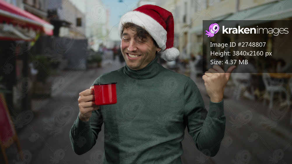 Hispanic man wearing christmas hat smiling holds red cup while pointing on busy street suggesting a festive mood outdoors.