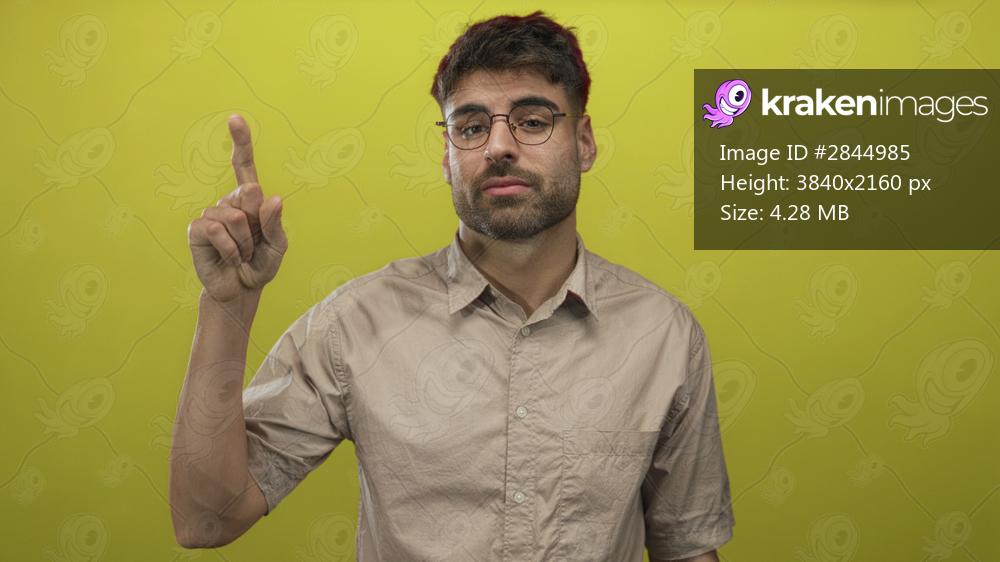 Hispanic man wearing glasses counting on fingers with his right hand in yellow studio; calculation doubt.
