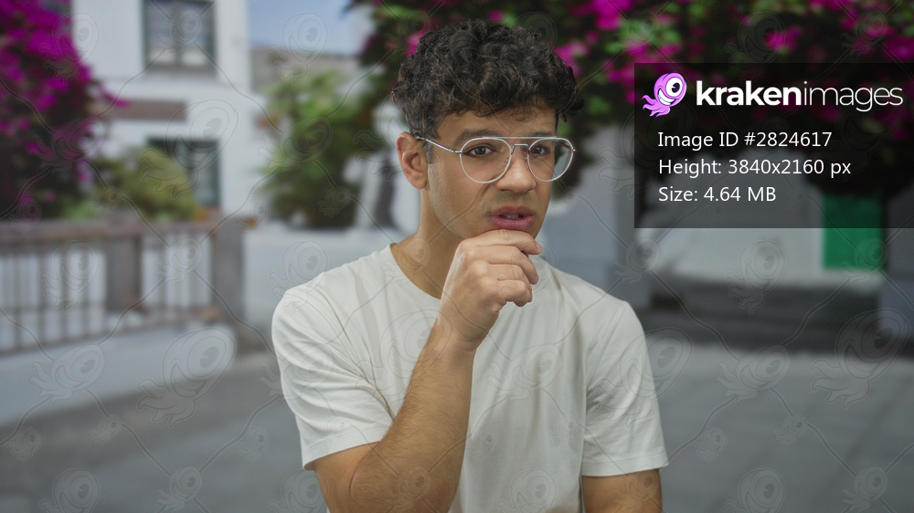 Hispanic man wearing glasses touches chin while standing in old town street; thoughtful reflection insight.