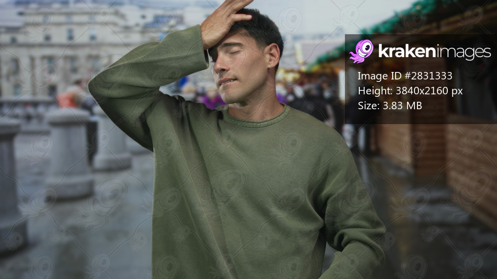 Hispanic man wearing green sweater with hand on forehead in busy city street market near wooden stalls; shock.