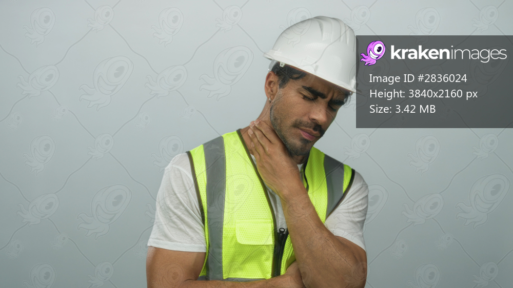 Hispanic man wearing hardhat helmet and neon safety vest coughing into fist in gray studio; discomfort.