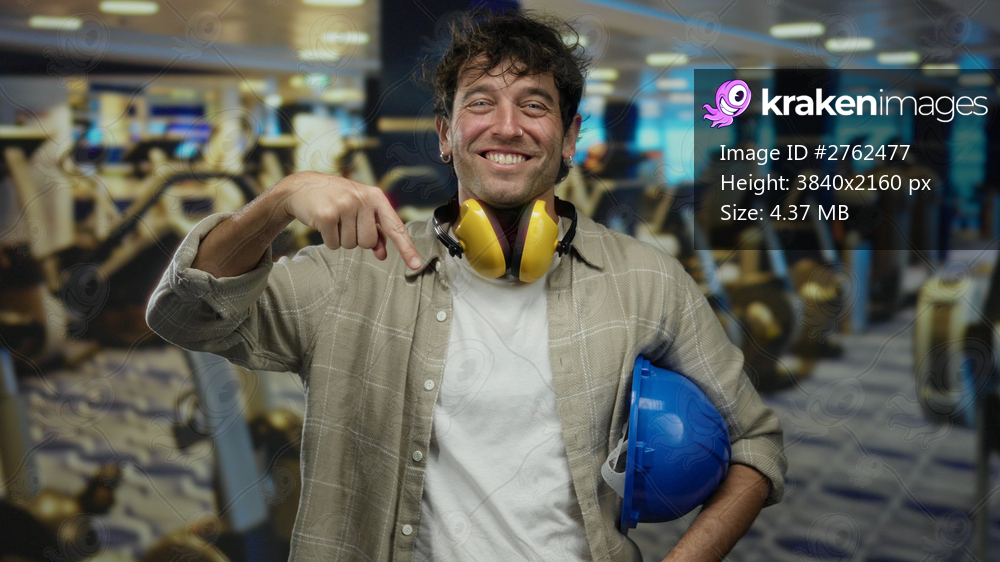 Hispanic man wearing headphones and a hardhat smiling confidently in a modern gym, surrounded by exercise equipment, highlighting indoor workplace safety. - Kraken Images