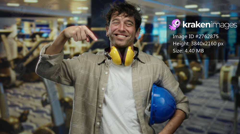 Hispanic man wearing headphones and a hardhat smiling confidently in a modern gym, surrounded by exercise equipment, highlighting indoor workplace safety. - Kraken Images