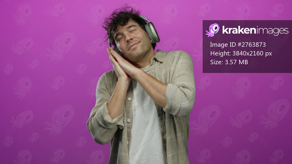 Hispanic man wearing headphones gestures sleeping contentedly against vibrant pink background enjoying music.