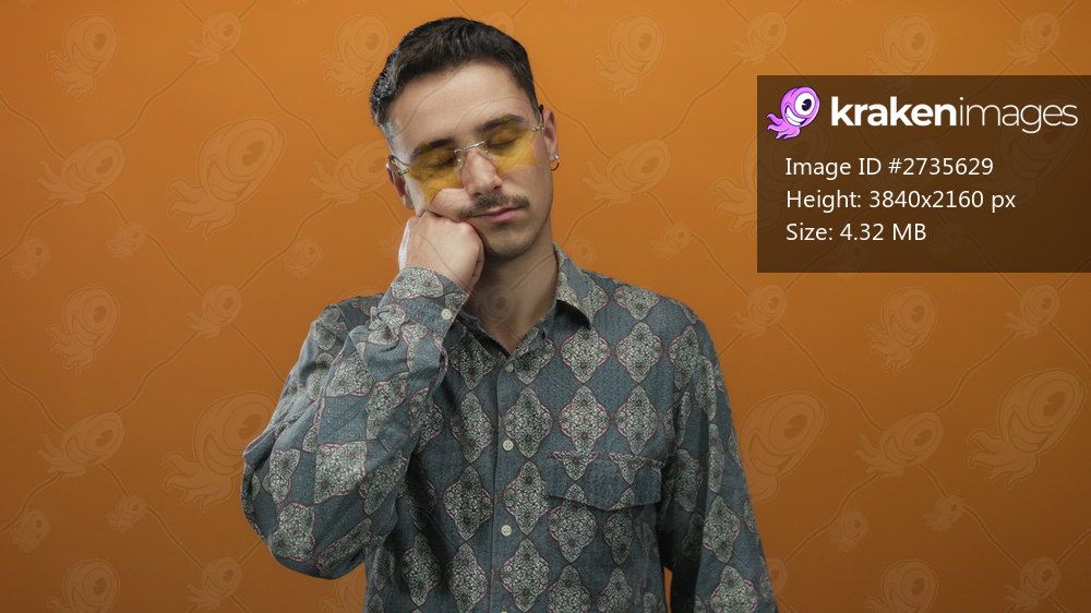 Hispanic man wearing patterned shirt and glasses resting thoughtfully on his fist against vivid orange isolated wall creates a modern and introspective scene. - Kraken Images