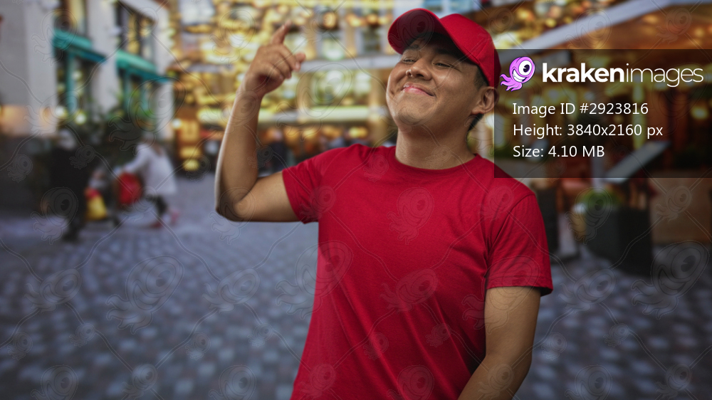 Hispanic man wearing red cap and red tshirt pointing finger upward on cobblestone street near outdoor cafes and decorative lights; confidence.