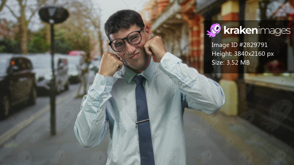 Hispanic man wearing round glasses and a blue shirt pressing cheeks with fists on city street in front of a brick building; toothache.