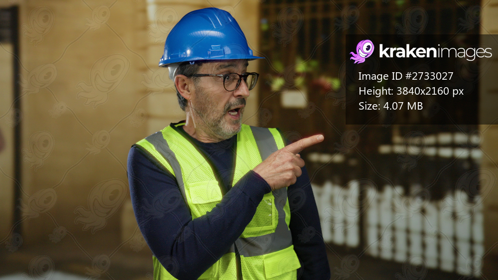 Hispanic man wearing safety vest and hard hat, gesturing on a city street during his construction work, embodies industry and urban outdoor environment. - Kraken Images