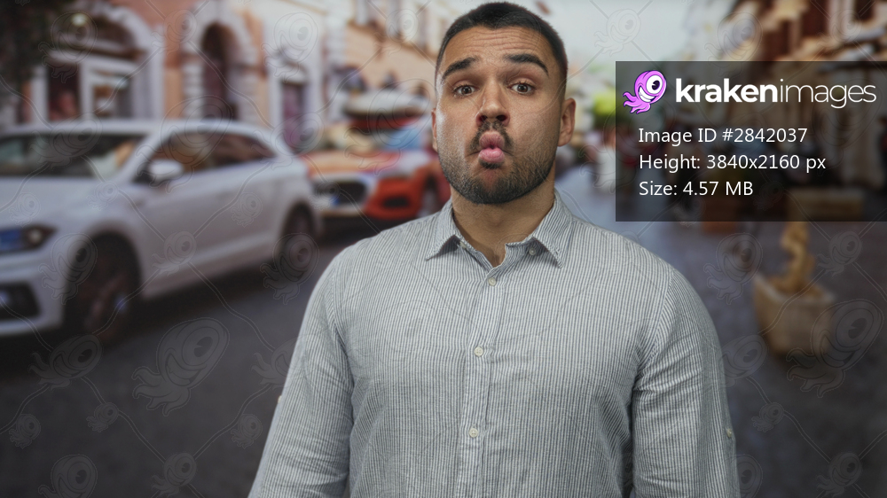 Hispanic man wearing striped shirt purses lips on bustling city street; playful expression joy humor.