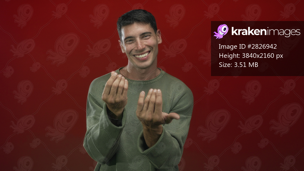 Hispanic man wearing sweater smiling broadly beckons with hands in studio with red background; welcoming.