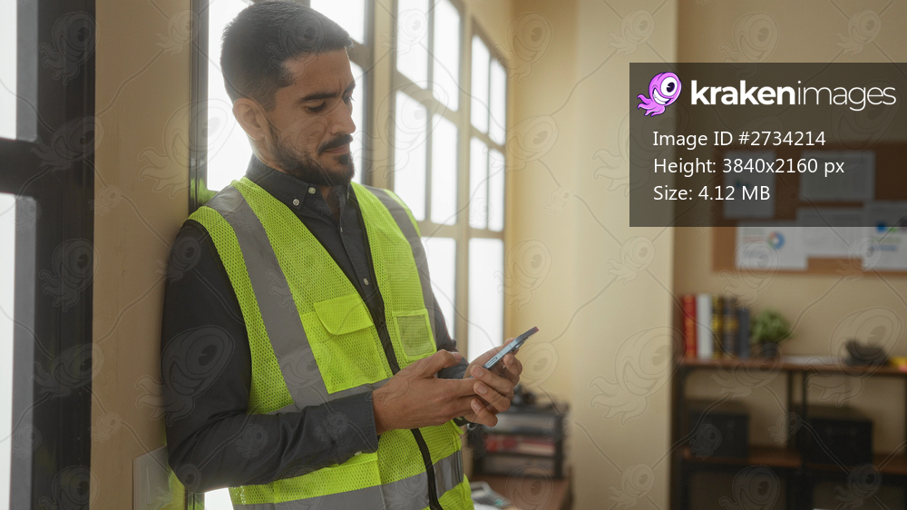 Hispanic man wearing vest holds phone looking thoughtful in bright office leaning against window exuding contemplation.