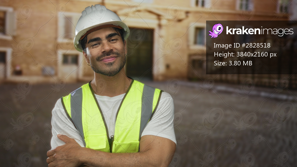 Hispanic man wearing white hardhat and yellow safety vest with arms crossed outside an old town building; confidence.