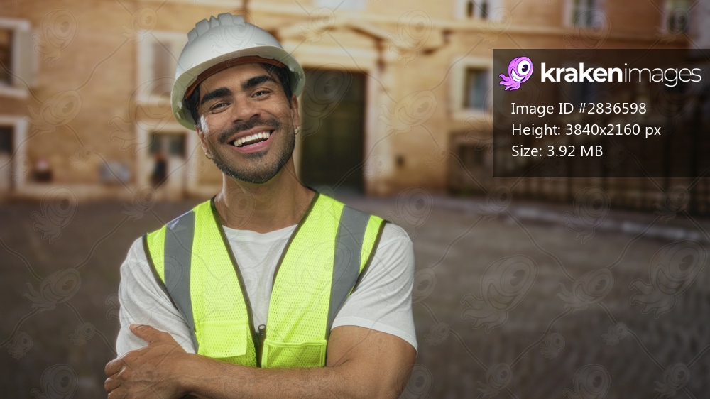Hispanic man wearing white hardhat and yellow safety vest with arms crossed outside an old town building; confidence.