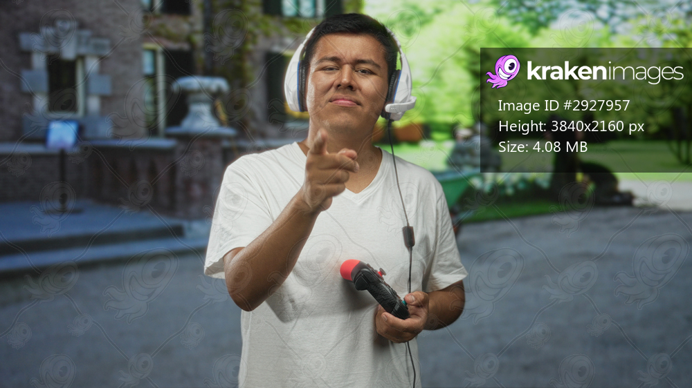Hispanic man wearing white headset holding game controller and pointing finger on street; joy calm gaming.