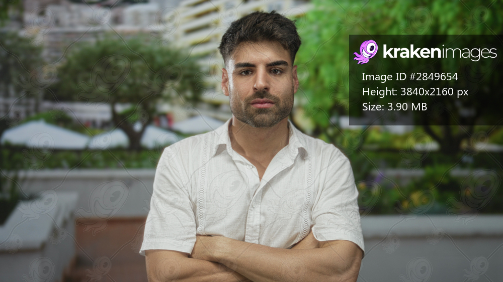 Hispanic man wearing white shirt crossing bare arms on urban tree lined street in city; introspection solitude.