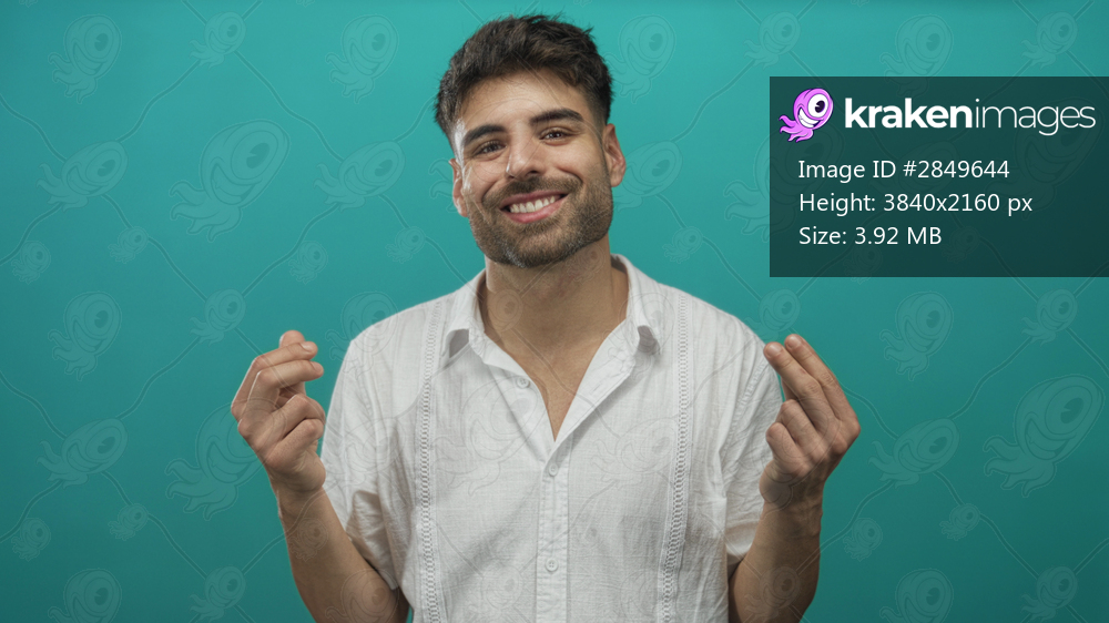 Hispanic man wearing white shirt showing money gesture with pinched fingers in teal studio setting; confidence.