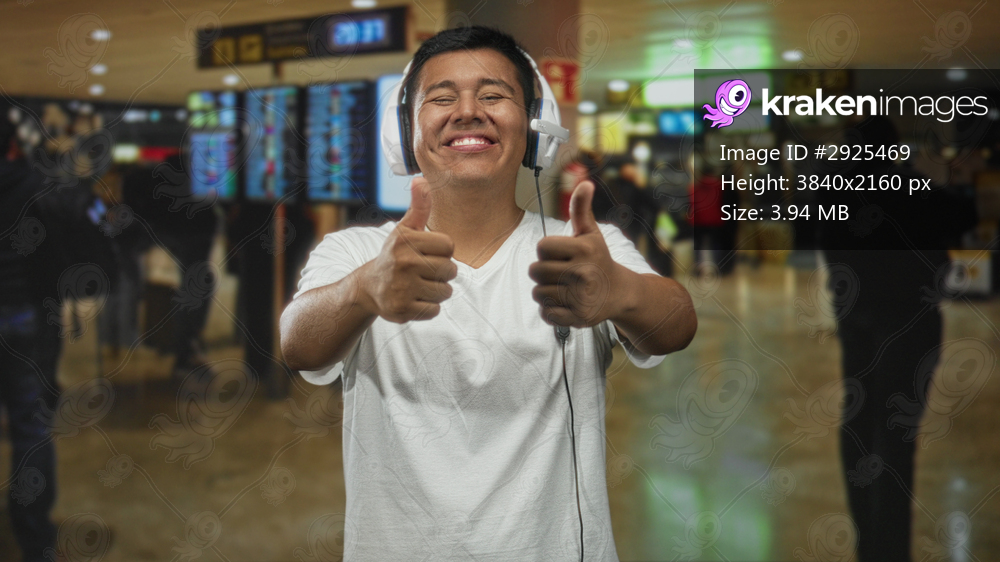 Hispanic man wearing white t shirt with headset smiling and giving thumbs up in busy airport terminal; travel joy.