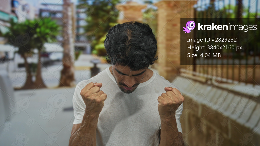Hispanic man wearing white t shirt holds temples with both hands and closes eyes on sunny city street; stress.