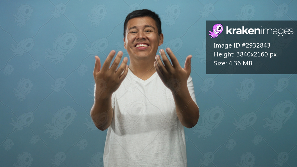 Hispanic man wearing white t shirt smiling and pointing both index fingers toward camera in blue studio; joy confidence.