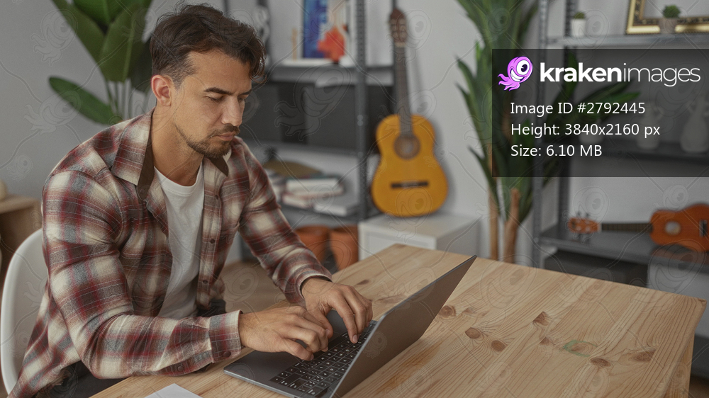 Hispanic man working on a laptop in a modern office, displaying stress amidst an interior with plants and a guitar in the background, reflecting a busy workplace environment. - Kraken Images
