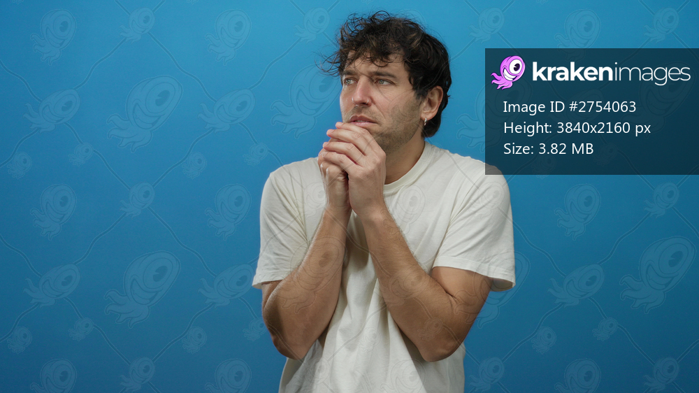 Hispanic man with worried expression clasps hands nervously against a plain blue background wearing a simple white shirt.