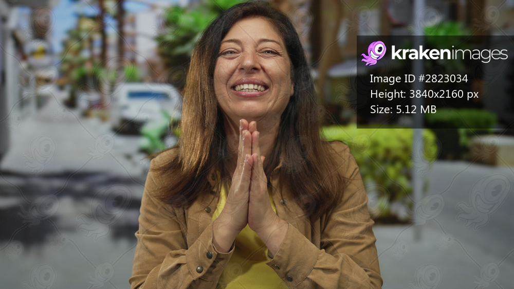 Hispanic middle age woman claps raised hands with open mouth on sunny city street amid blurred storefronts and potted shrubs; joy.