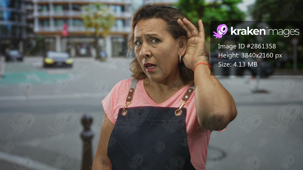 Hispanic middle age woman cupping hand to ear on a city street, wearing pink shirt and apron; concern.