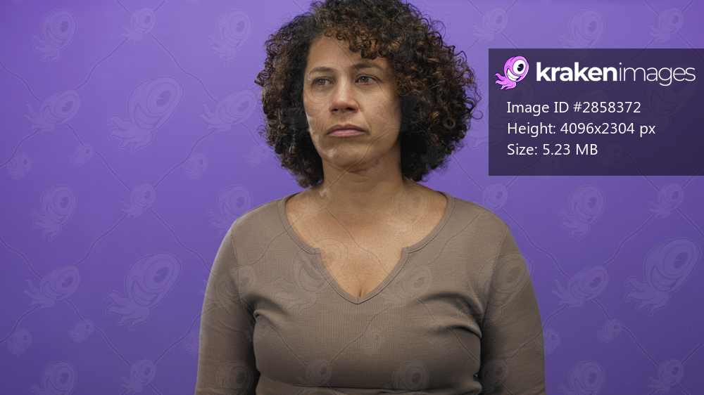 Hispanic middle age woman with curly hair checking wristwatch while standing against purple studio wall; impatience.