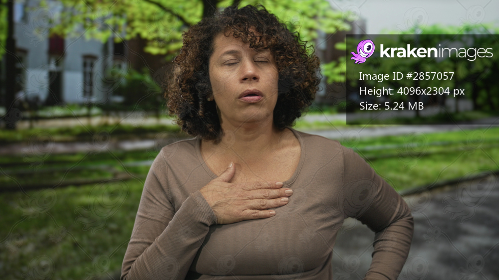 Hispanic middle age woman with curly hair clutch chest in green park with blurred building and neutral expression; urgent health concern.