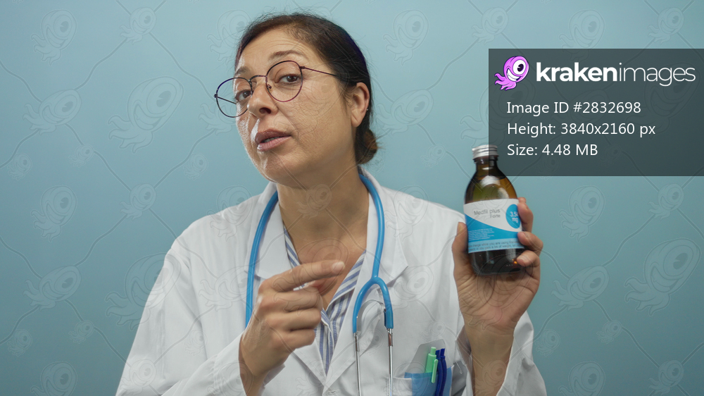 Hispanic middle age woman doctor points finger to bottle in a light blue studio; health advice wellness trust.