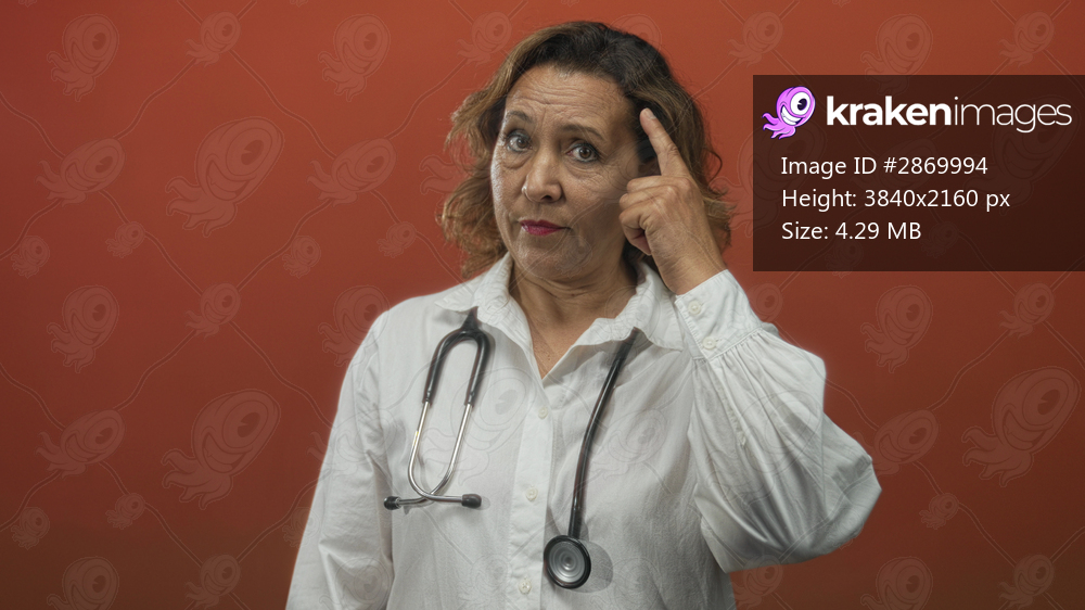 Hispanic middle age woman doctor wearing stethoscope points finger to head in studio with orange background; thinking.
