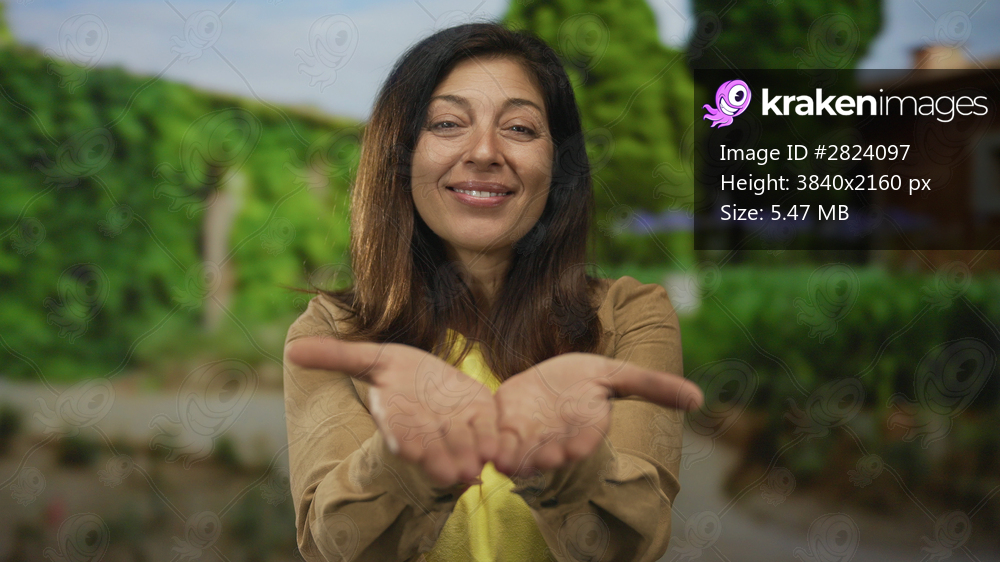 Hispanic middle age woman holds open palms in forest under bright sunlight and lush foliage overhead; serenity.