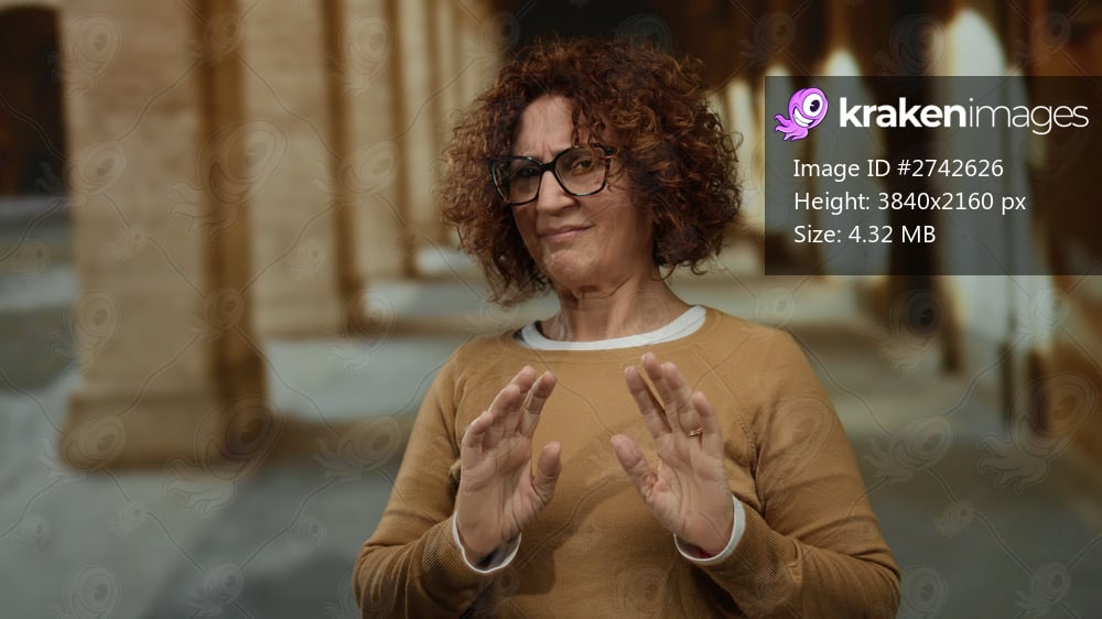 Hispanic middle age woman in an old university setting makes a rejection gesture outdoors, capturing emotion and heritage against ancient architecture backdrop, wearing glasses. - Kraken Images