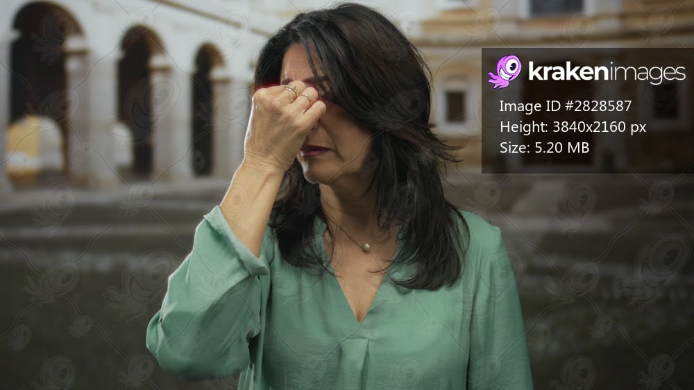 Hispanic middle age woman in green blouse pinches nose in building at university beside arches; disgust.