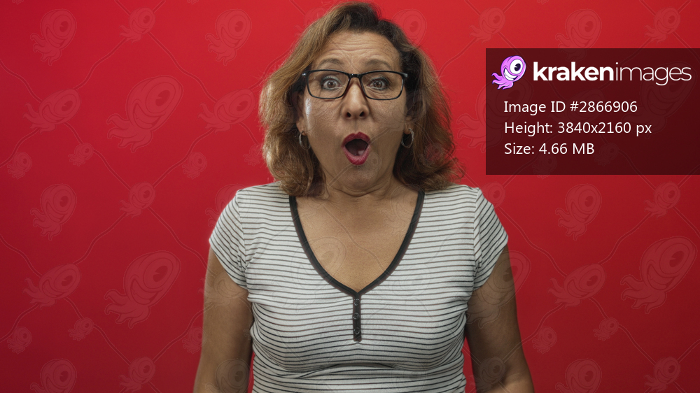 Hispanic middle age woman wearing glasses mouth open gestures hands forward in studio with red backdrop; surprise.