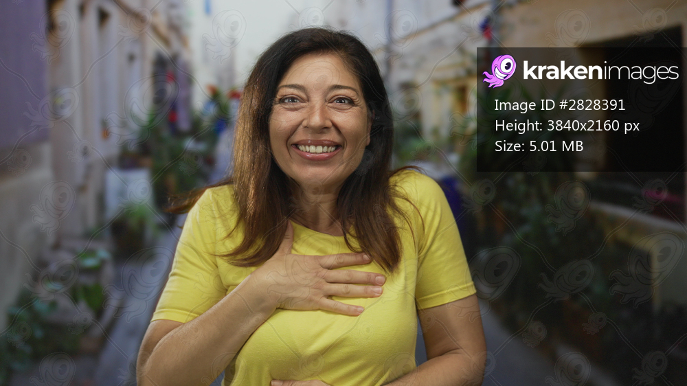 Hispanic middle aged wide eyed woman with hand on chest and open mouth expressing surprise on narrow street; joy.