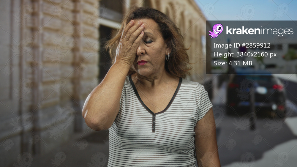 Hispanic middle aged woman covers forehead with hand against brick building on street; anxiety reflection.