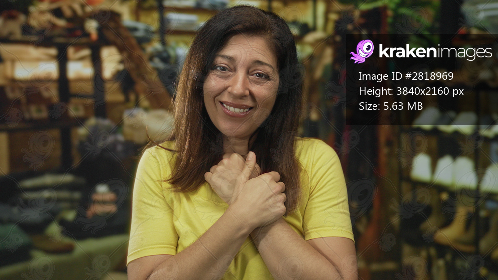 Hispanic middle aged woman crosses hands over chest while smiling amid shoe racks in clothing store; comfort.