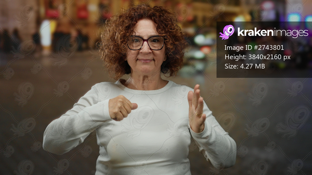 Hispanic middle-aged woman with curly hair gesturing with fist in palm in an urban street setting showing determination at night.