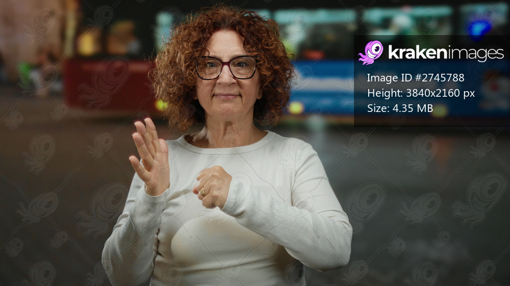 Hispanic middle-aged woman with curly hair gesturing with fist in palm in an urban street setting showing determination at night.
