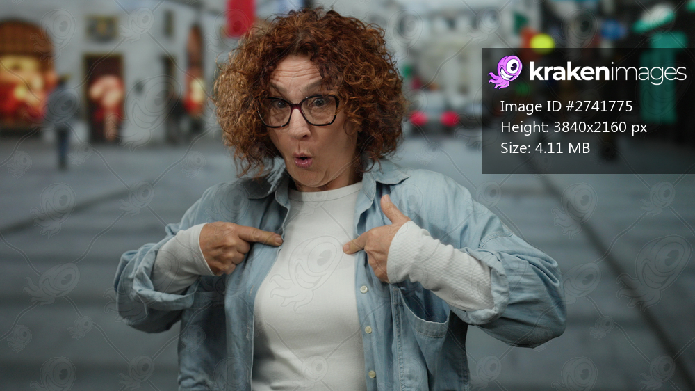 Hispanic middle-aged woman with curly hair and glasses surprised in a city street, wearing a casual outfit, pointing at herself outdoors.