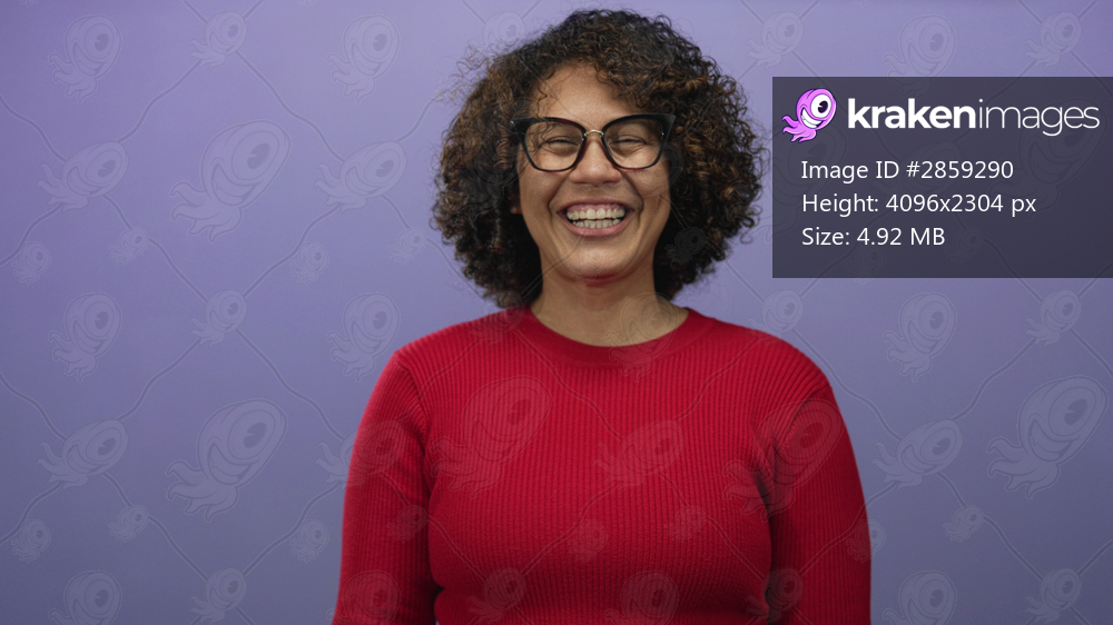 Hispanic middle aged woman with curly hair and glasses wearing red sweater covers face with hand in purple studio; shyness.
