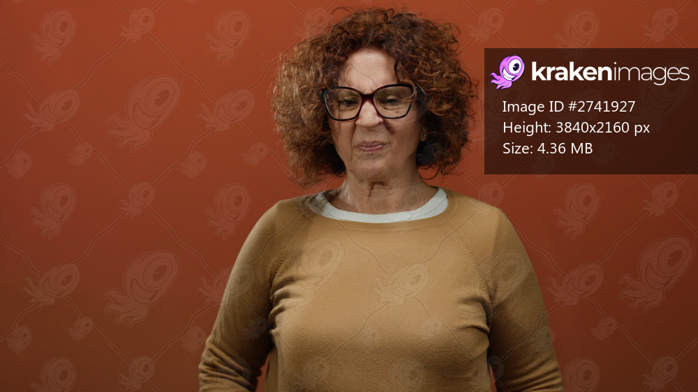Hispanic middle-aged woman with curly hair makes a strange face reacting to a bad smell against a brown background.